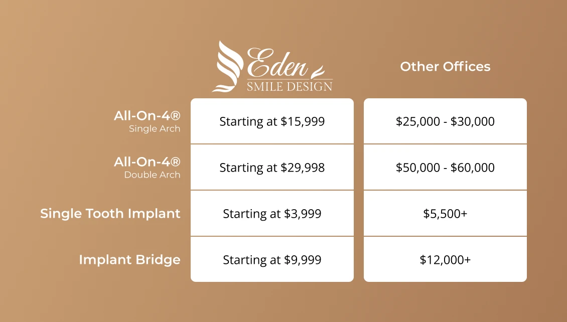 At Eden Smile Design, you can rest assured that you’re getting the absolute best price for your dental implant treatment without sacrificing quality. This is due to our state-of-the-art technology and in-house lab, which allow us to complete your entire procedure and teeth fabrication under one roof. Not only does this lead to fewer visits, quicker turnaround times, and a more precise final result, but also lets us pass our savings onto you!